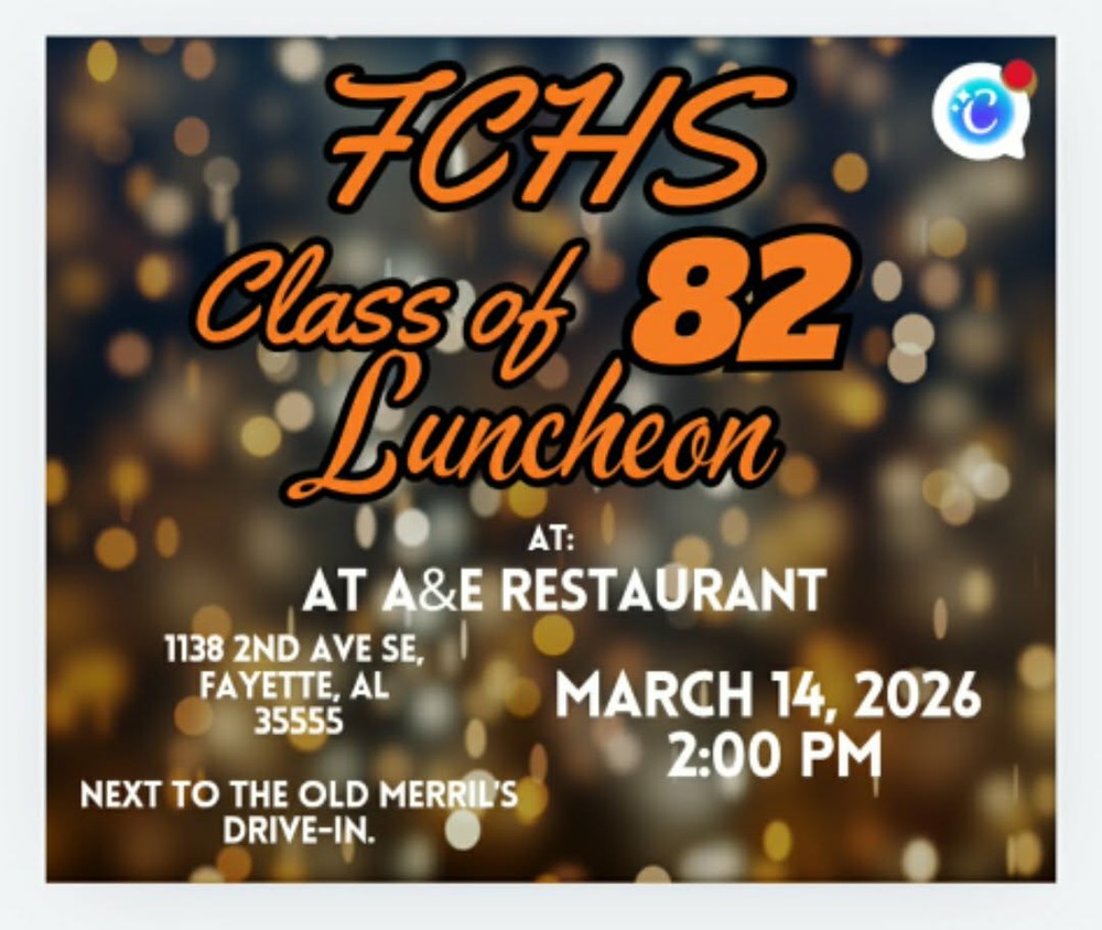 The FCHS / FA Class of 1982 had a lunch get together at the A&E Restaurant in Fayette on March 14, 2026. We had 14 classmates attend this event. Rita Hardy Harkey organized the event and provided decorations and memorabilia for it. Photos from this gathering are posted and were provided by Rita Hardy Harkey.